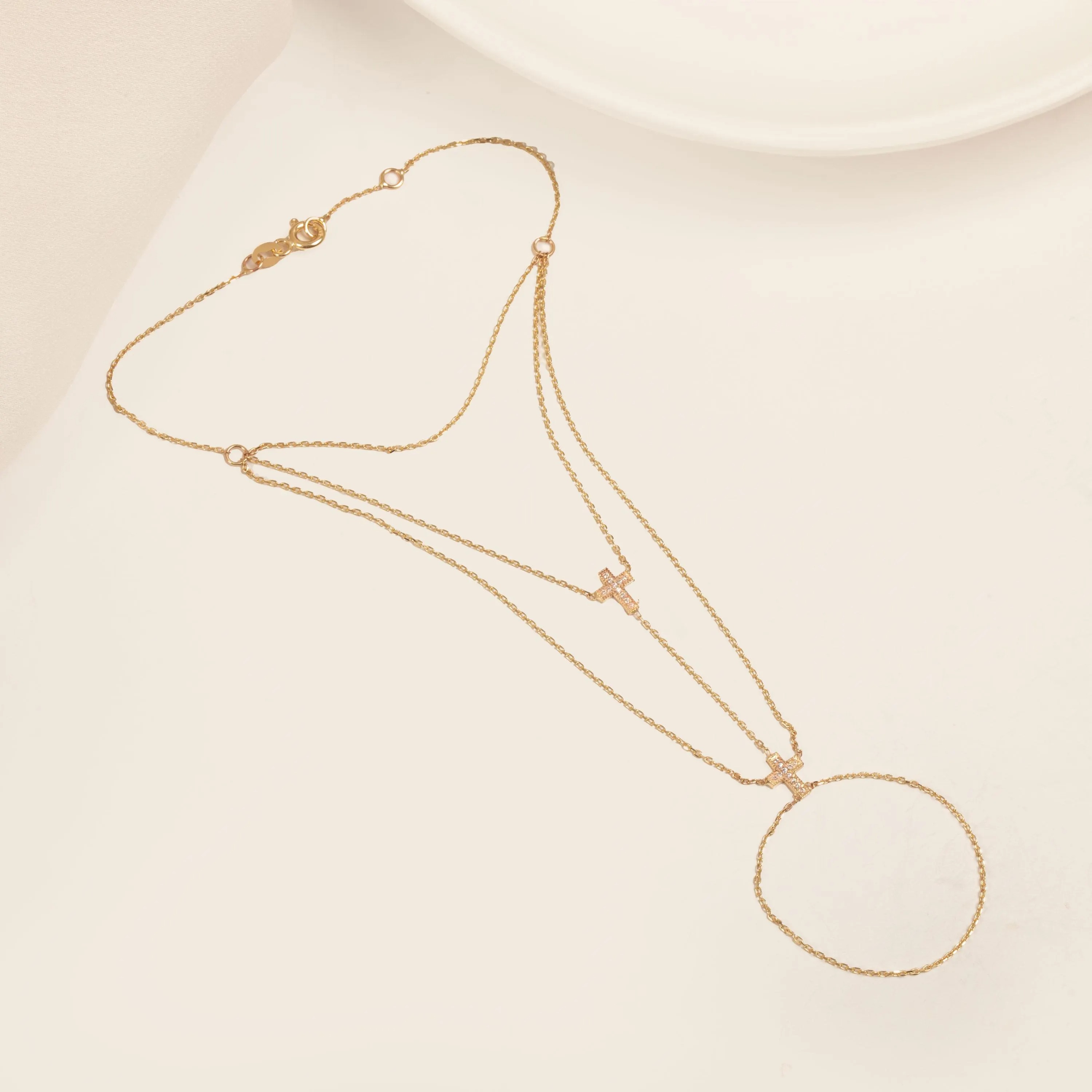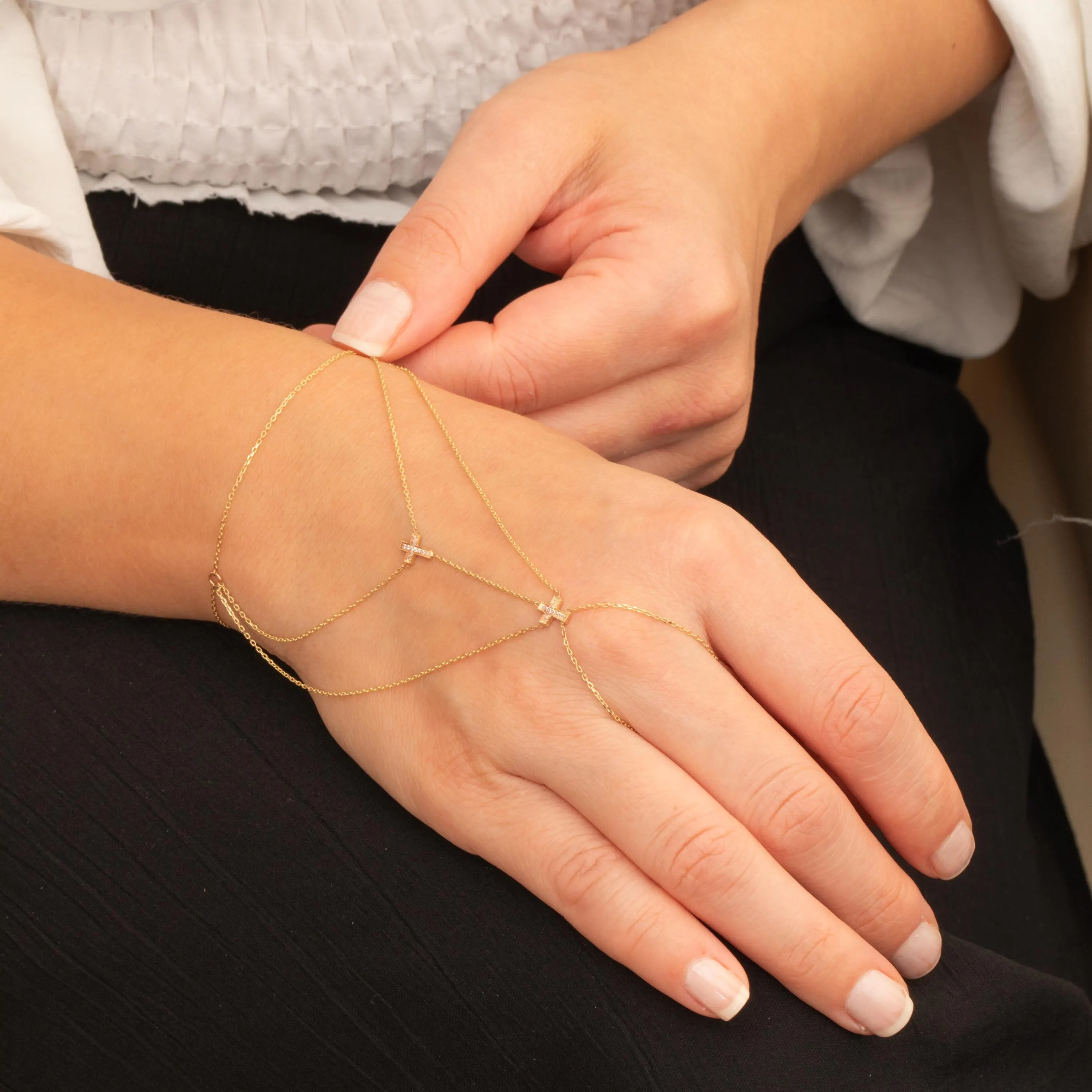This gold hand chain bracelet features a delicate pavé cross design set with shimmering stones for a refined and meaningful look. The double-strand triangular structure flows elegantly from finger to wrist, creating a balanced and graceful silhouette. Perfect for everyday wear or special occasions, it adds both symbolism and sparkle to your style.