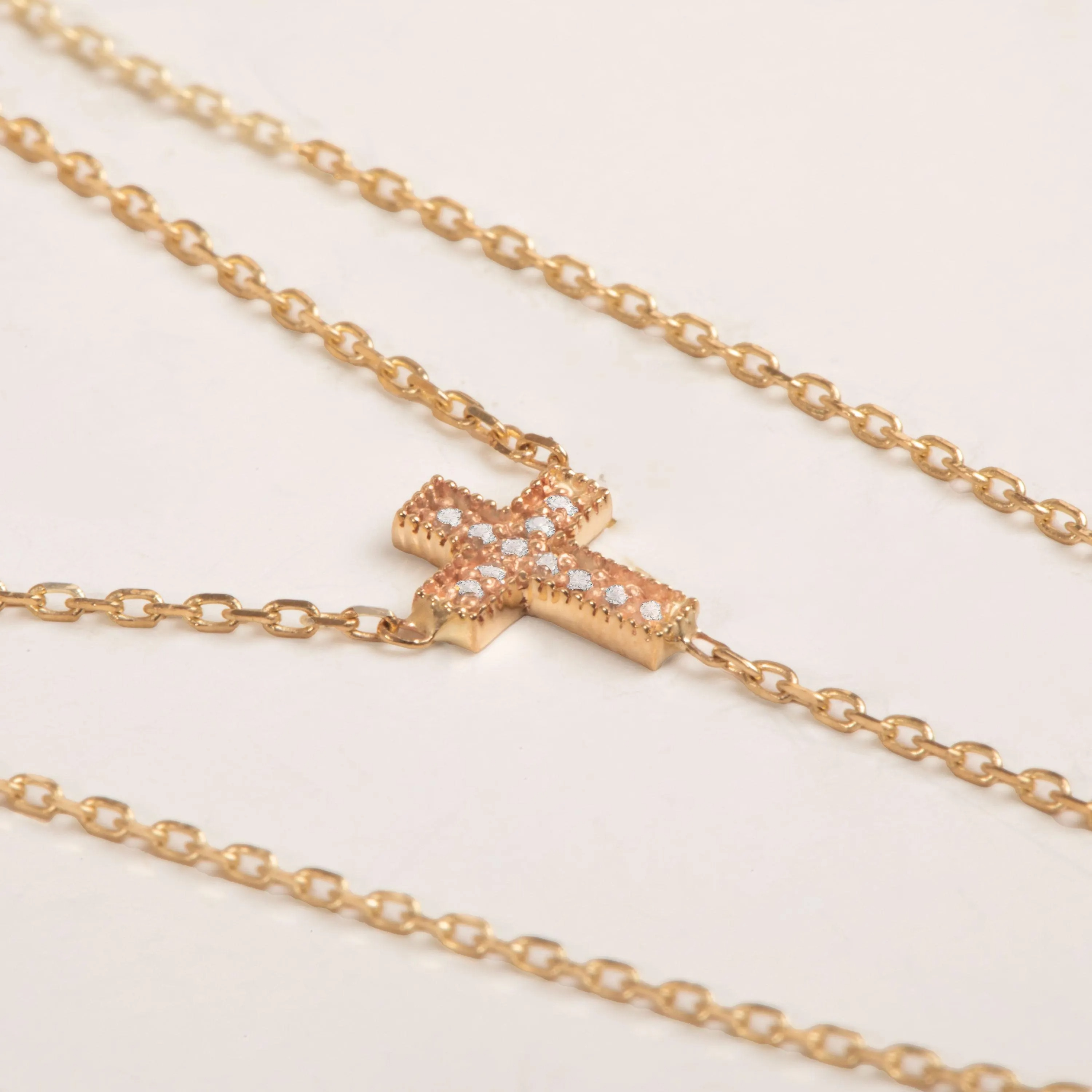 Crafted in 14K or 18K gold. Available in yellow, white, and rose gold. Features approximately 0.06–0.07 carat total diamond weight. Stones are round brilliant cut with G-H color and SI clarity. CZ option is also available. Includes 22 stones set in pavé (prong) setting. Chain type is fine curb chain with approximately 0.84 mm thickness. Cross size is approximately 7.3 x 5.8 mm. Closure type is spring ring clasp. Designed as a connected piece including finger loop, chain, and bracelet. Adjustable length. Optional engraving available on clasp tag. Slight variations may occur due to handcrafting. Made to order.