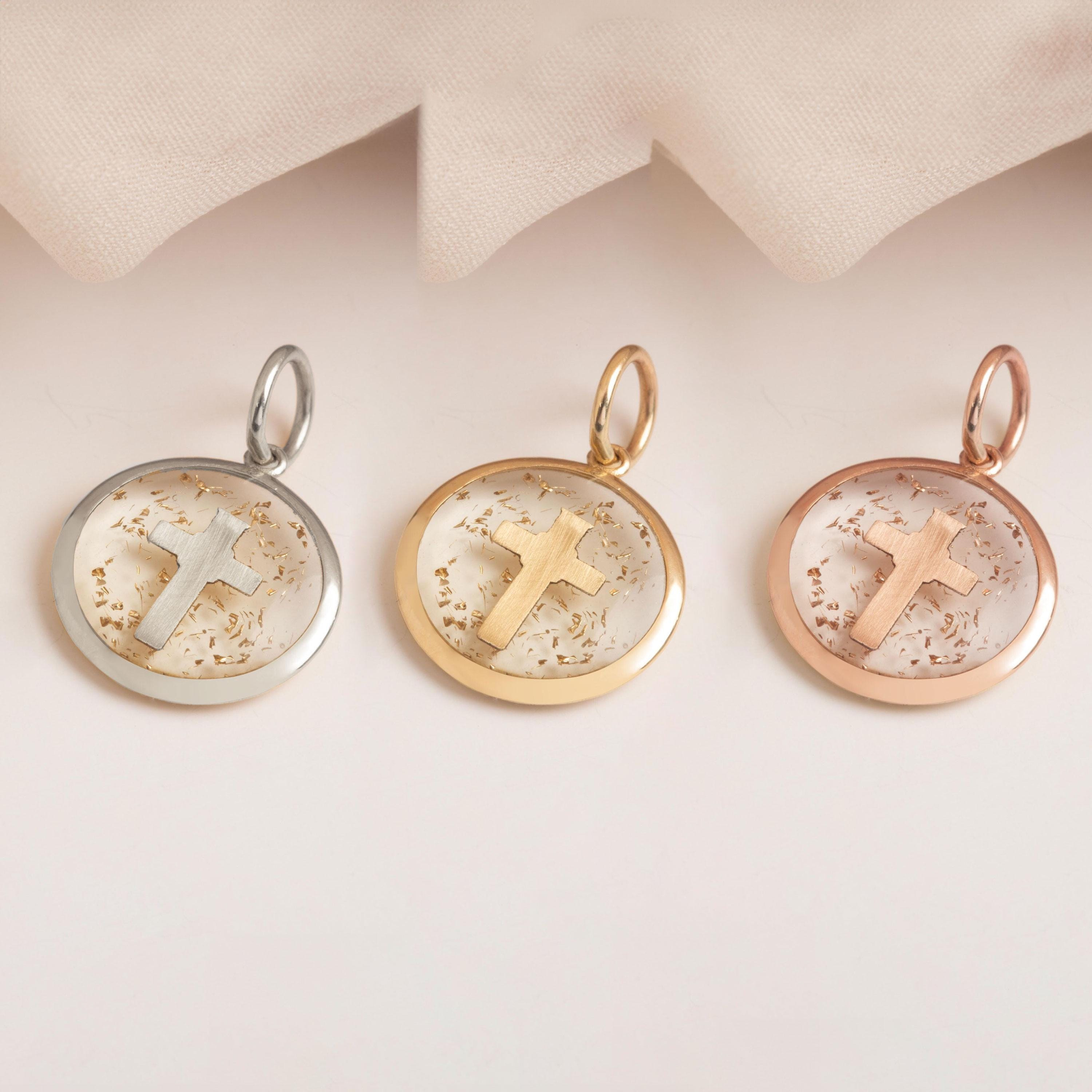 Technical Details Crafted from 14K or 18K solid gold. The cross is encased in clear resin with decorative gold dust elements. Available in yellow gold, rose gold, and white gold. Pendant diameter measures approximately 14 mm. Personalizable design, made to order.