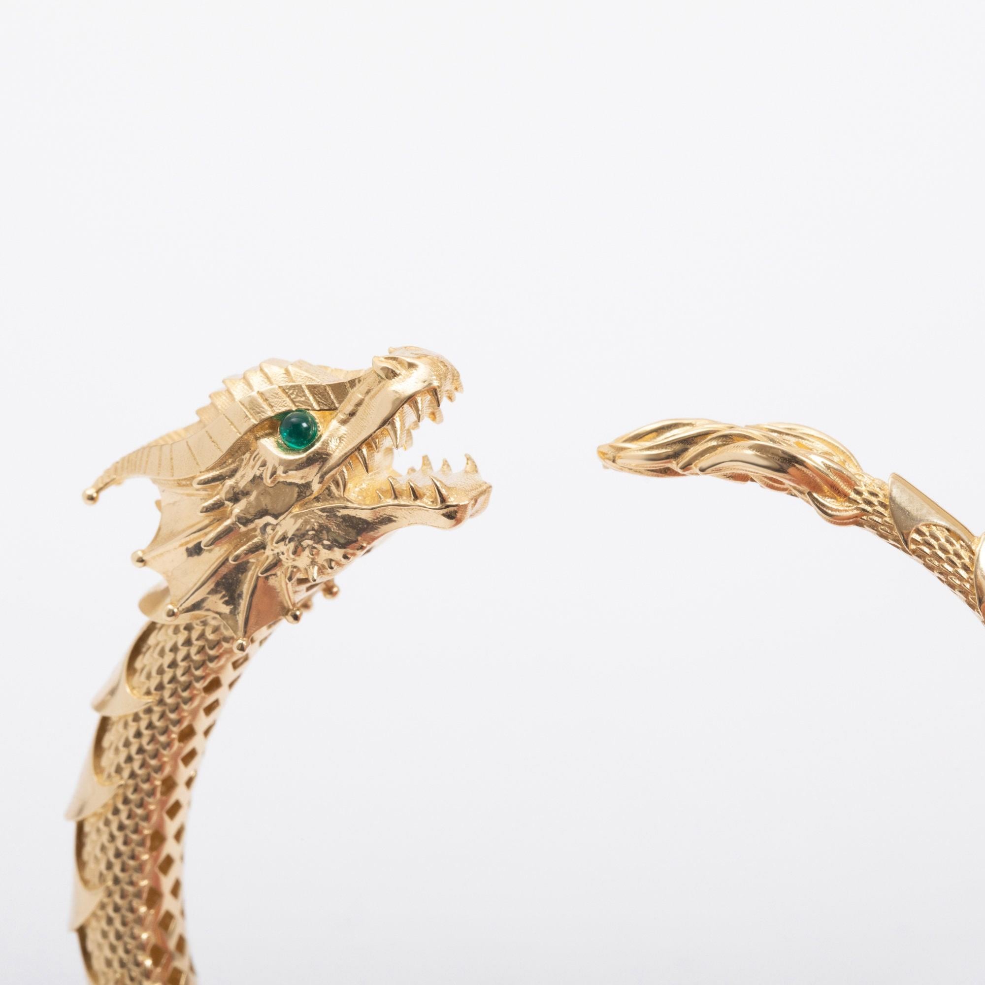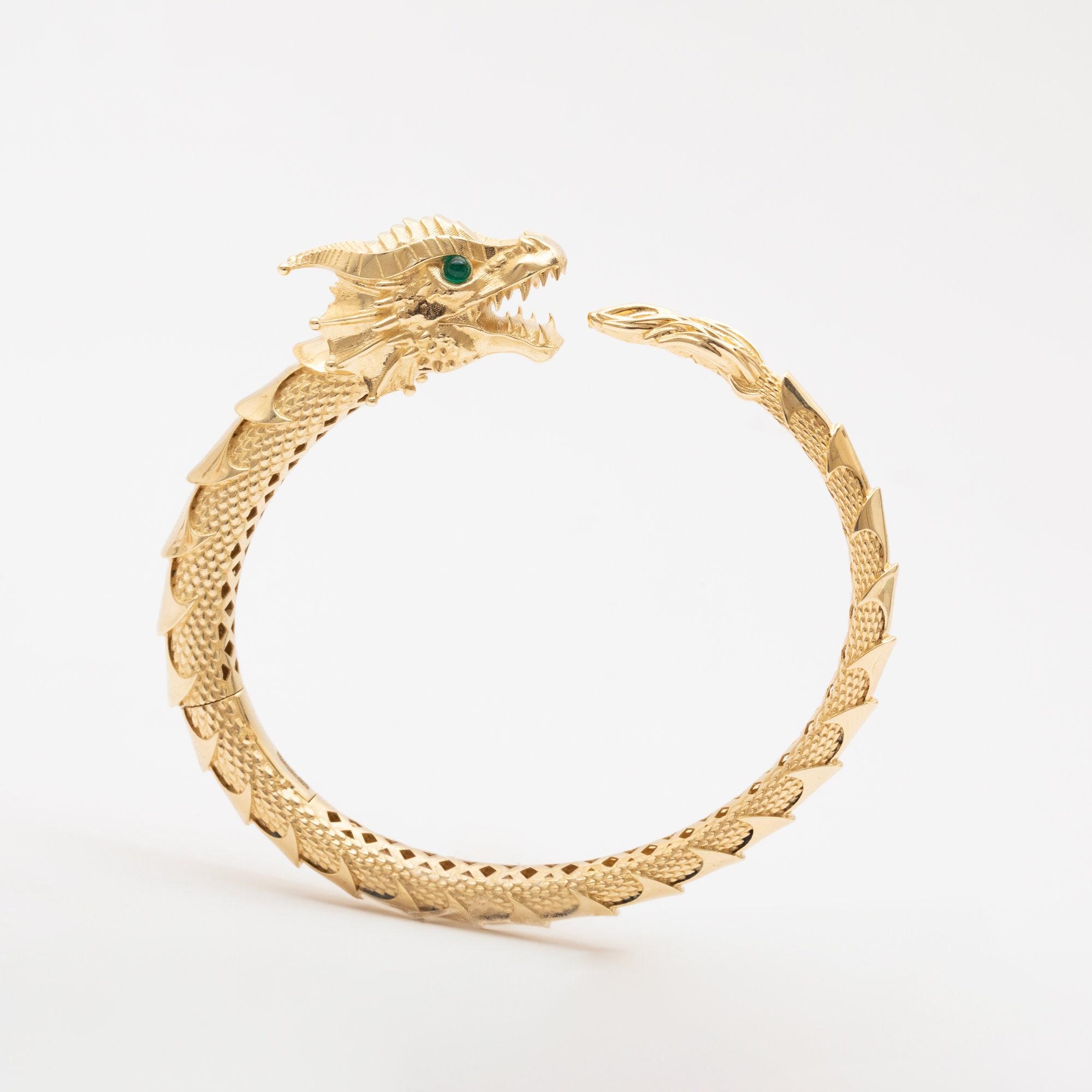 The bracelet features an open cuff design with sculpted dragon head details. It measures approximately 58 mm in diameter and 48 mm in height, with the dragon head measuring about 14.5 mm wide and 16.5 mm high. Each piece is made to order.