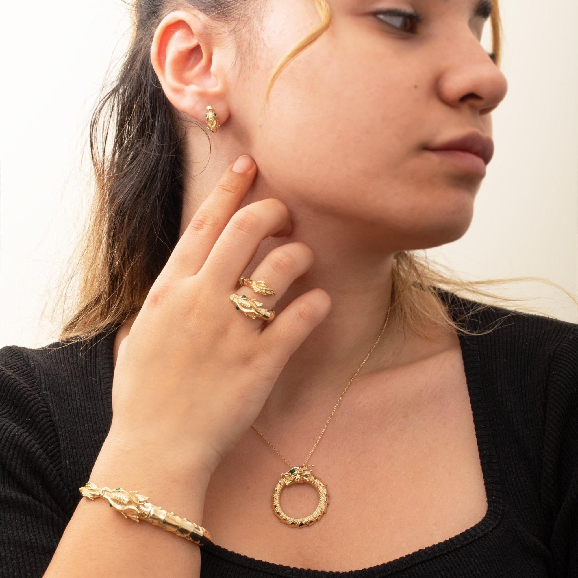 This dragon head gold cuff bracelet draws inspiration from Viking mythology and ancient symbolism. Designed as an open bangle, it delivers a bold presence on the wrist while representing strength, protection, and power through its detailed dragon motif. A timeless statement piece for those who appreciate mythological and symbolic jewelry.