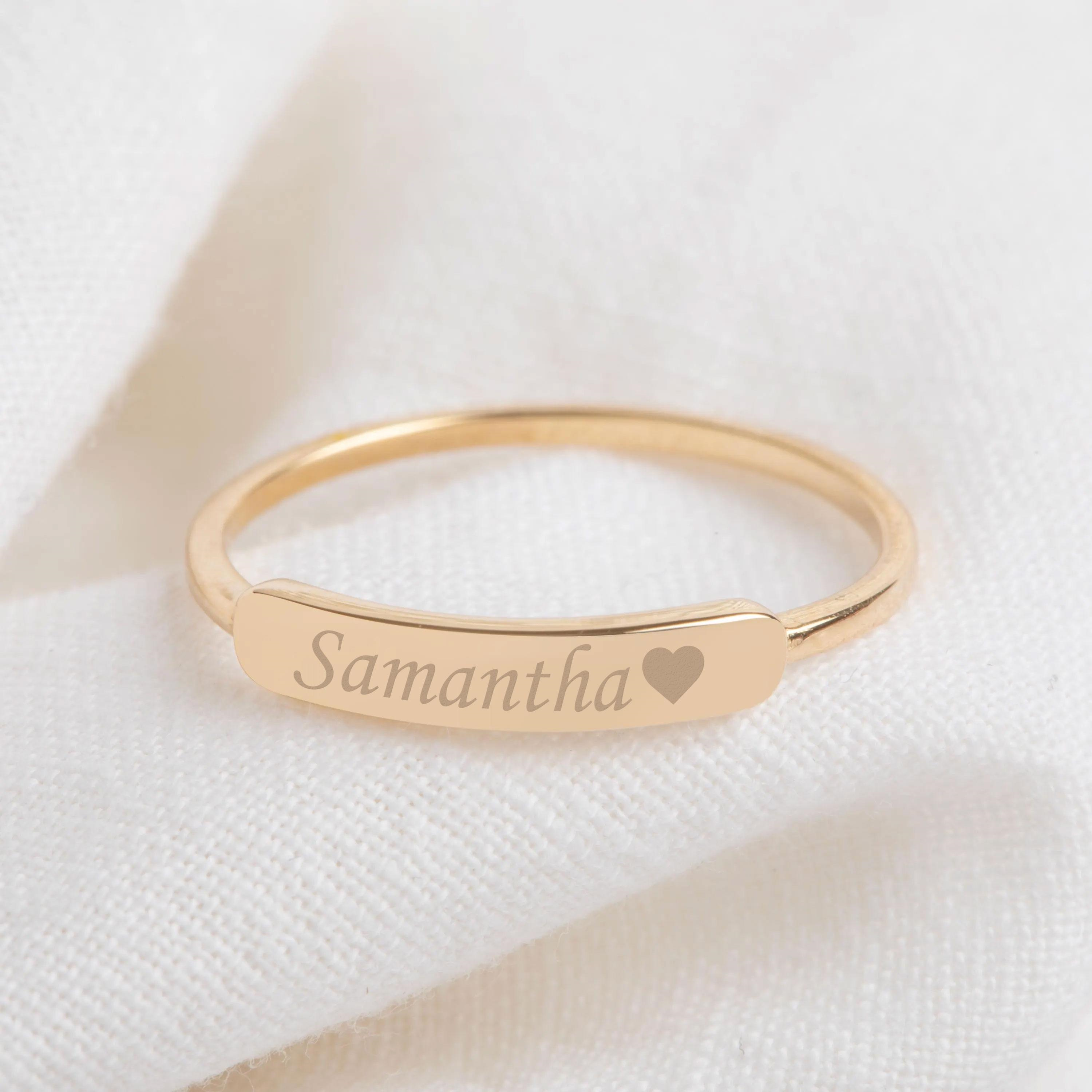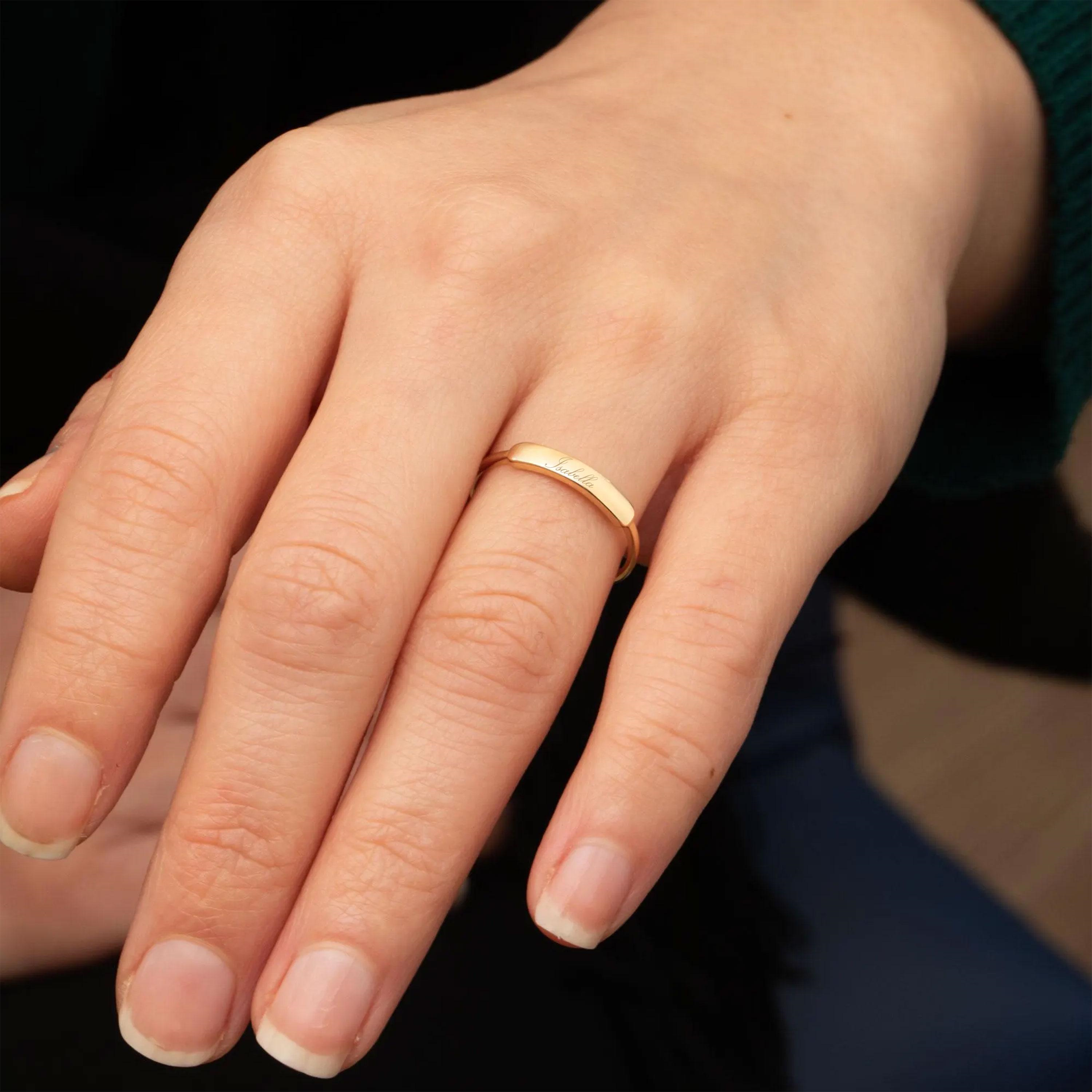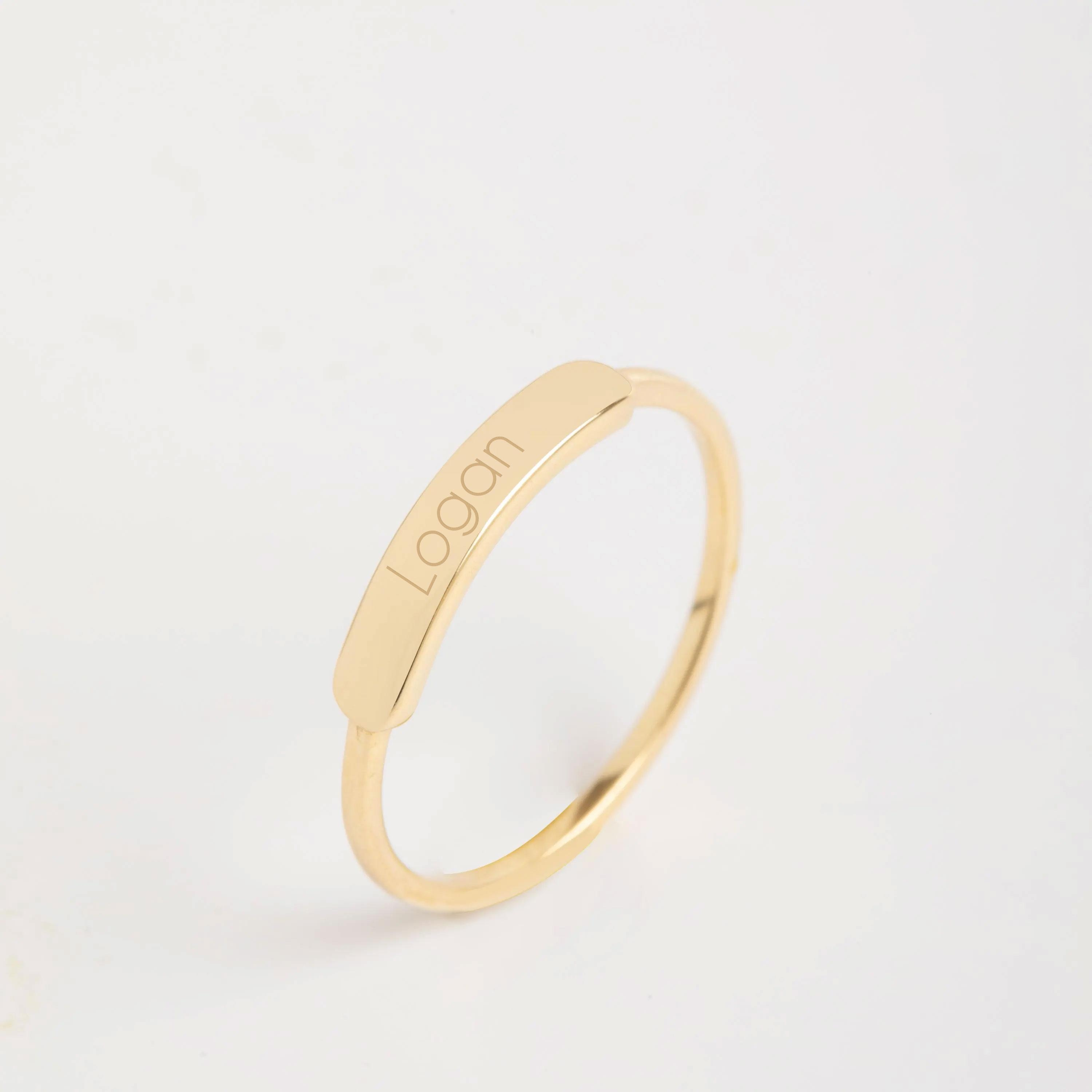 This engravable gold bar ring features a sleek and minimalist design, created to carry a personal message such as a name, date, or meaningful symbol. Its slim profile makes it perfect for everyday wear, while the clean bar detail adds a refined statement when worn alone or stacked. A timeless piece designed to hold lasting memories.