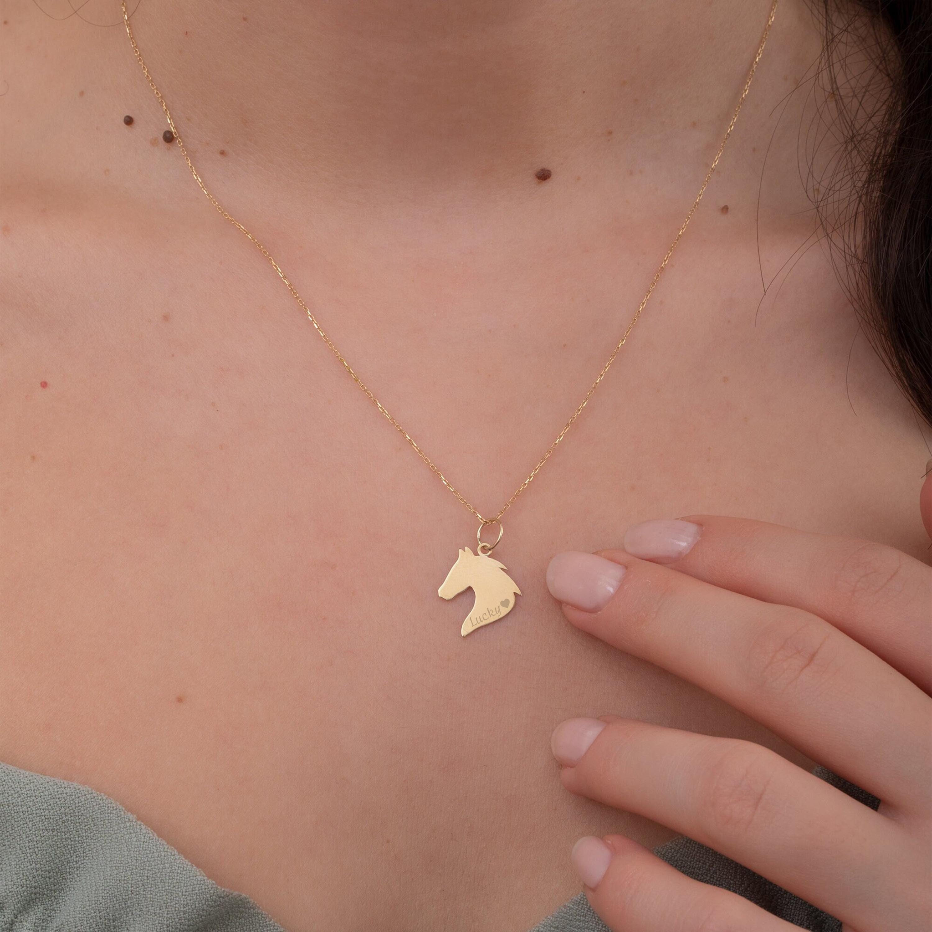 The Gold Personalized Horse Necklace represents freedom, strength, and noble spirit through its refined horse head design. Its minimalist proportions make it ideal for everyday wear. Personalized engraving with an initial or name adds emotional value, making this necklace a meaningful and timeless gift for animal lovers and those inspired by the symbolism of the horse.